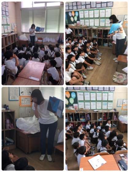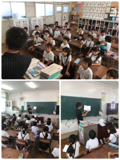 1年1組では、越智先生が英語の本を読んでくださいました。しっかりと聞けています。