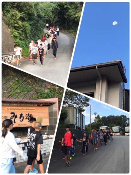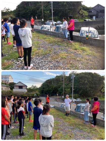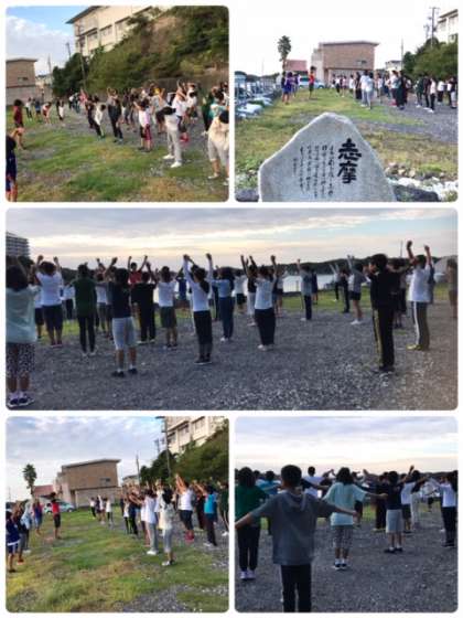 ホテルの下の海辺の広場へ移動して朝の会を行います。