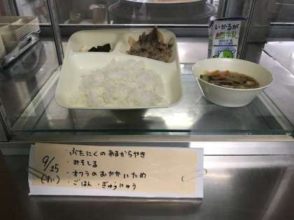 豚肉の甘辛焼き、味噌汁、オクラのおかか炒め、ご飯、牛乳