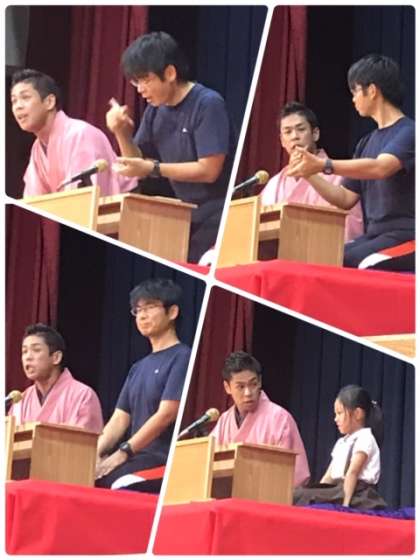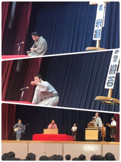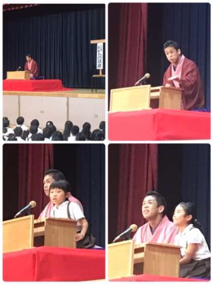 10月1日、上方落語協会から本物の落語家さんやお囃子をして下さる方々をお招きし、落語について教えていただきました。午前中は低学年です。1人で何役も演じる落語についての解説を聞き、実際の所作やお囃子も体験させていただきました。