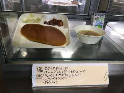 マグロのオーロラ煮、ベーコンとジャガイモのスープ、キャベツのゆずドレッシング、パンキプンパン、牛乳