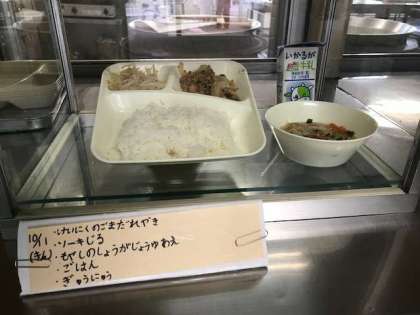 鶏肉のゴマだれ焼き、ソーキ汁、もやしのしょうが醤油和え、ご飯、牛乳
