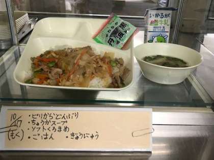 ピリ辛丼、中華スープ、ソフト黒豆、牛乳