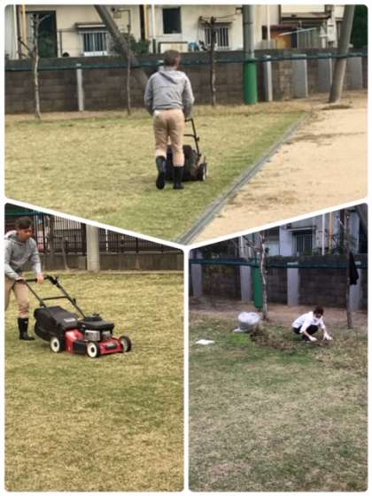 まず、下準備として、昨日18日の夕方、芝生実行委員会副委員長の山下さんはじめ委員数名で芝刈りと雑草抜きをしてくださいました。