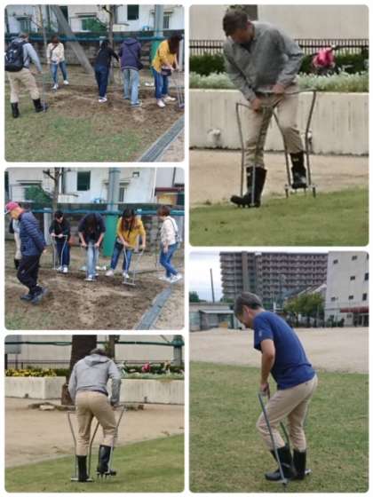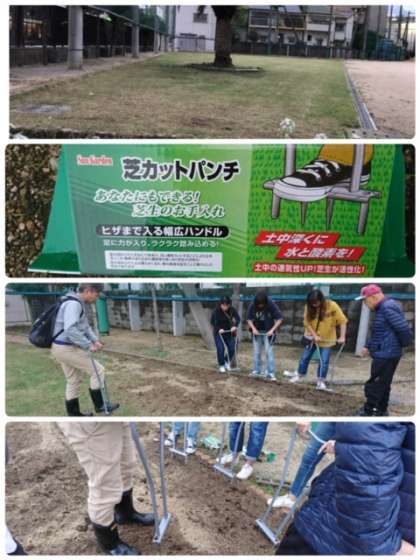本日19日10時より1時間ほどかけて、おおわだワクワク広場のエアレーションとオーバーシードを実施いたしました。
