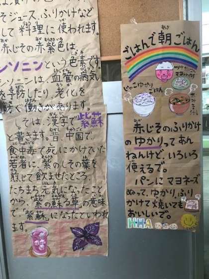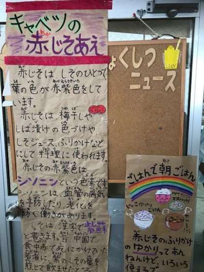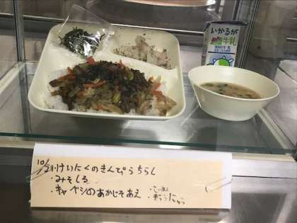 鶏肉のキンピラちらし、味噌汁、キャベツの赤紫蘇和え、ご飯、牛乳