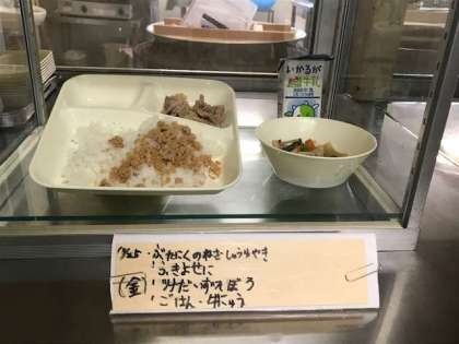 豚肉のネギ醤油焼き、吹き寄せ煮、ツナ大豆ソボロ、ご飯、牛乳