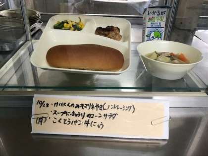 鶏肉の味噌マリネ焼き、スープ煮、きゅうりとコーンのサラダ、黒糖パン、牛乳