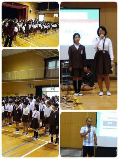 全校児童で「気球に乗ってどこまでも」を合唱しました。