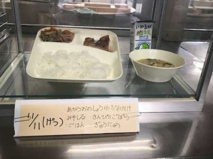 赤魚の醤油だれかけ、味噌汁、きんぴらごぼう、ご飯、牛乳