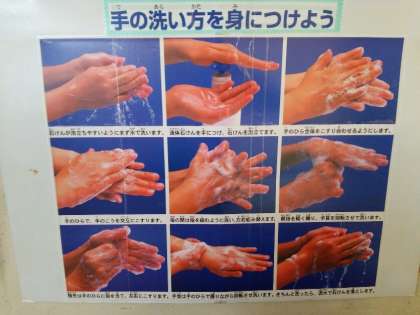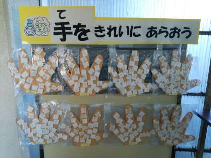 保健室前には、先日の体重測定の際に実施した、手の汚れ調べと、正しい手洗いの仕方のポスターを長橋先生が掲示してくださっています。