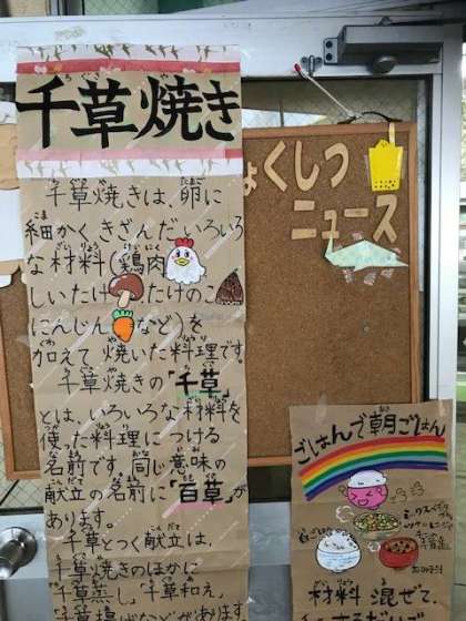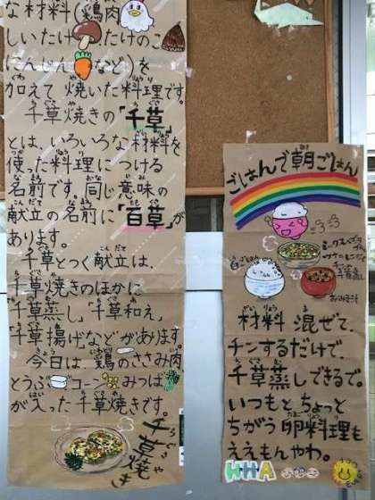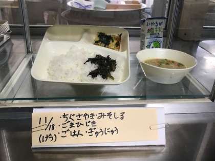 千草焼き、ゴマひじき、味噌汁、ご飯、牛乳