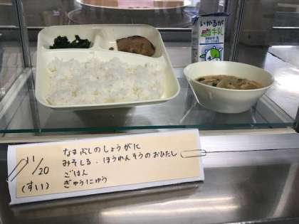 生節の生姜煮、味噌汁、ほうれん草のおひたし、ご飯、牛乳