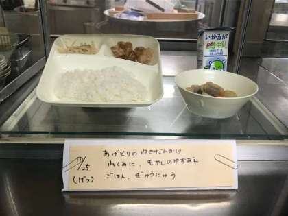 揚げ鶏のネギだれかけ、含め煮、もやしの柚子の香あえ、ご飯、牛乳