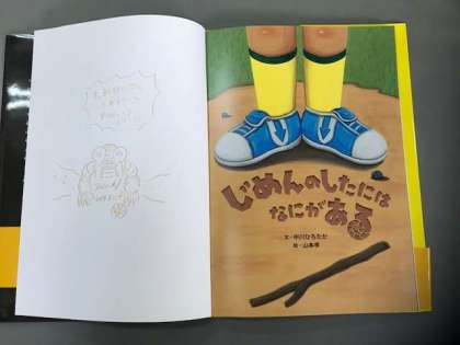 本日ゲストティーチャーとしてお越しいただいた楠 章子さんが、大和田小学校の子どもたちのために、絵を描かれている山本 孝さんにサインをしていただいた本を贈呈していただきました。