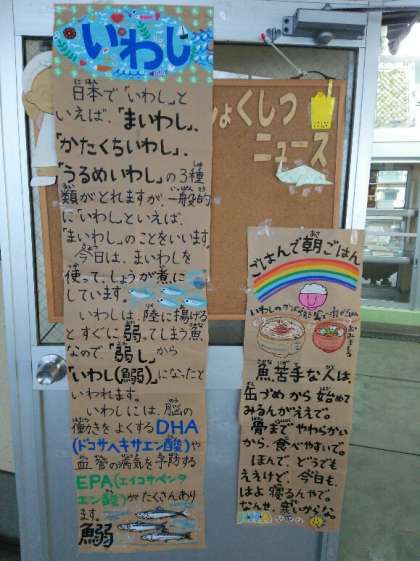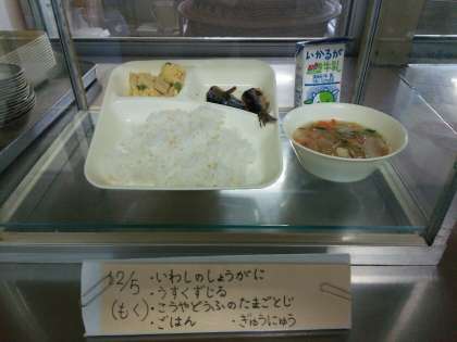 今日の給食の献立は、いわしのしょうが煮、うすくず汁、高野豆腐の卵とじ、ご飯、牛乳です。
