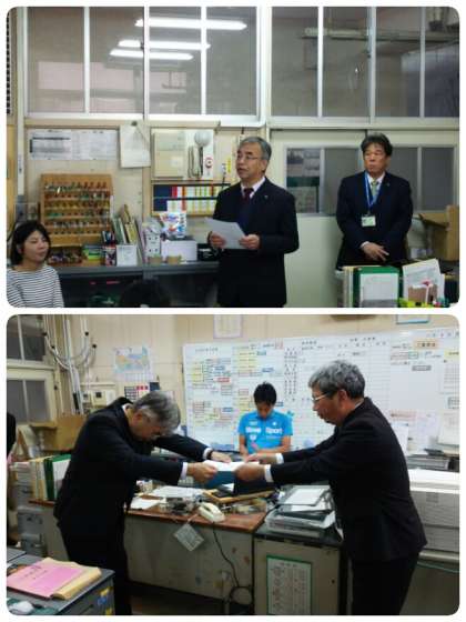 贈呈式では、学校を代表して津田校長先生が川俣徹支部長より図書セットのブックパックを受けとりました。