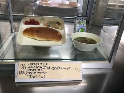 鮭のマリネ、肉団子と小麦のスープ、プチトマト、おさつパン、牛乳