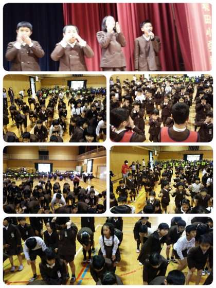 全校児童で、「頭、肩、ひざ、ぽん」の英語バージョンを歌いました。