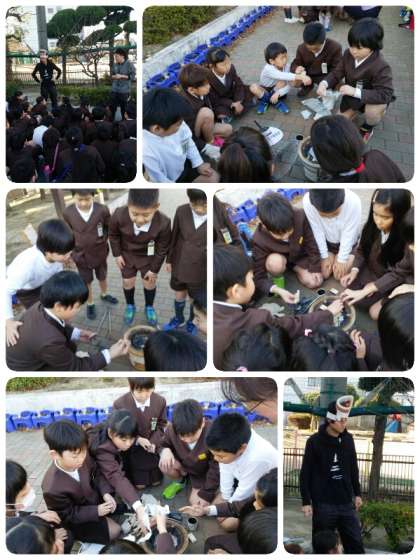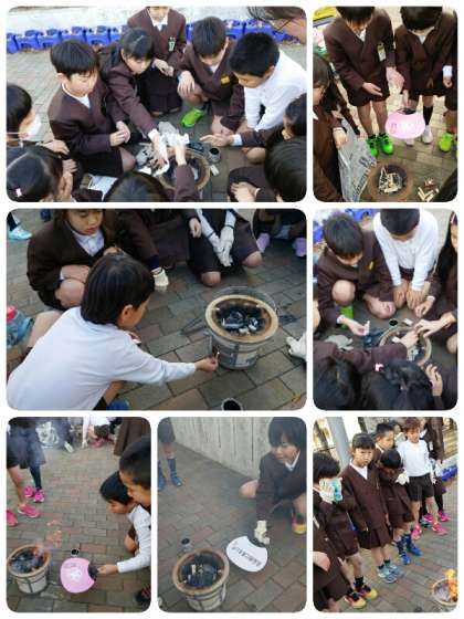 1、2組合同のグループで、七輪の中に新聞紙、木の小枝、木炭を順に入れ、マッチを使って火をつけ、木炭に火がつくまでうちわで頑張って扇ぎました。
