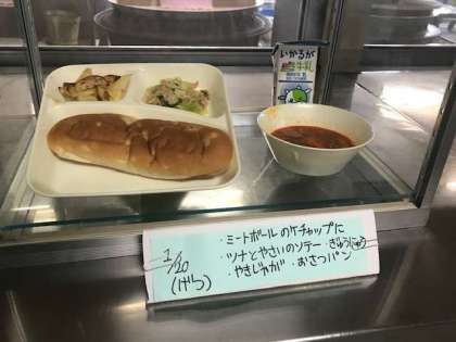 ミートボールのケチャップ煮、ツナと野菜のソテー、牛乳、焼きじゃが、おさつパン