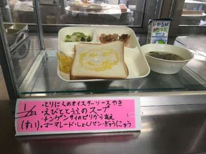 鶏肉のオイスターソース焼き、エビと豆腐のスープ、チンゲンサイのピリ辛和え、マーマレード、食パン、牛乳