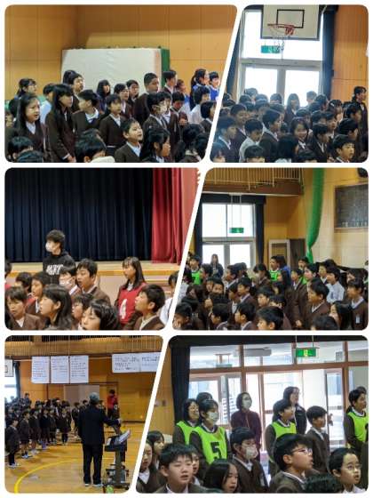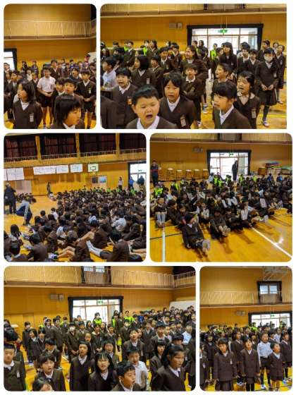 これまでの音楽集会で歌ってきた、「ありがとうの花」「気球にのってどこまでも」「明日があるさ 大和田バージョン」を校長先生の指導のもと、全校児童で歌いました。