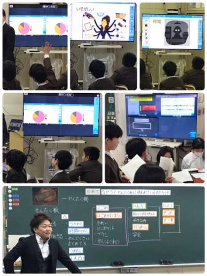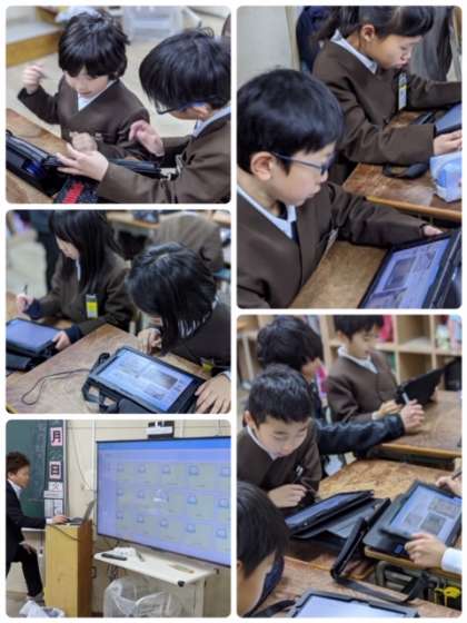 3年生は社会科の昔の暮らしについての学習でした。ICT機器を活用し、教材提示、投票機能、発表ノートの活用など、互いの考えを深め、共有する授業でした。