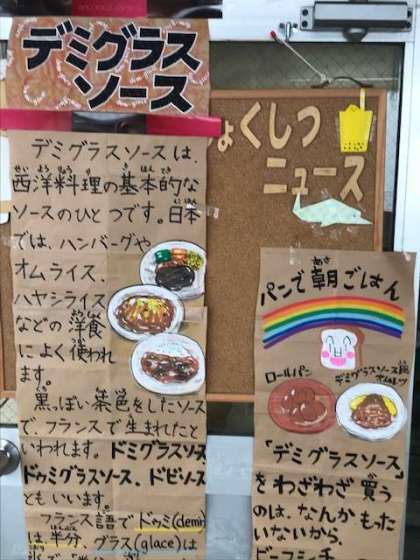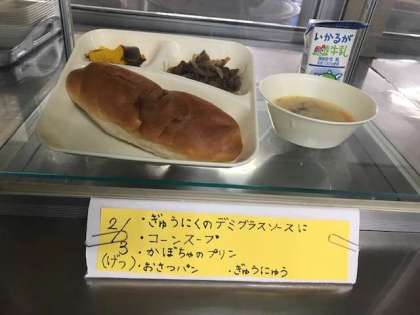 牛肉のデミグラスソース煮、コーンスープ、かぼちゃのプリン、おさつパン、牛乳