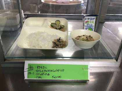 すき焼き煮、もやしとキュウリのしょうがづけ、ツナっ葉炒め、ご飯、牛乳