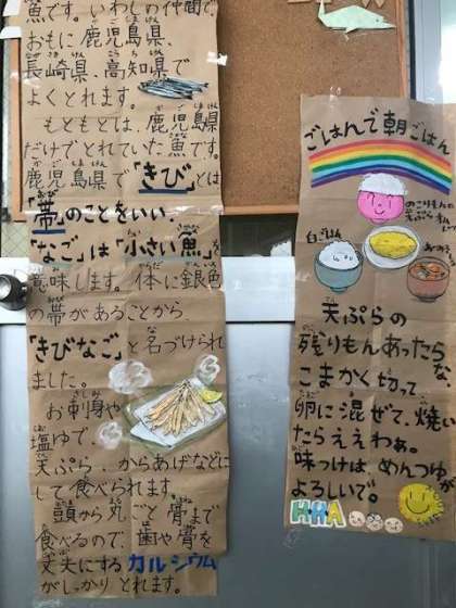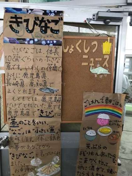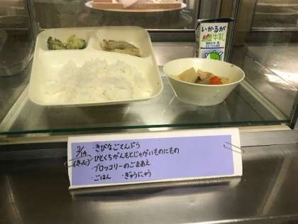 きびなごてんぷら、一口がんもとじゃがいもの煮物、ブロッコリーの胡麻和え、ご飯、牛乳