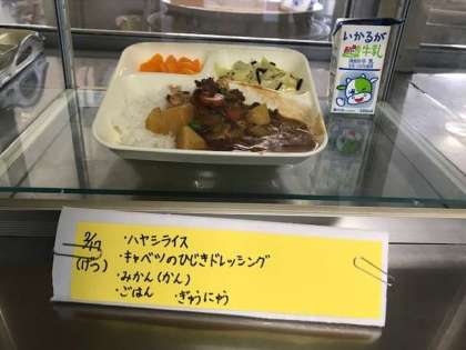 ハヤシライス、キャベツのひじきドレッシング、みかん、牛乳
