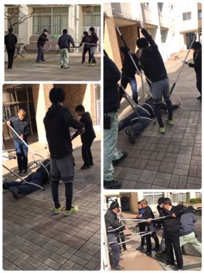 いかに子どもたちに近づけないかを考えての訓練です。実際に、さすまたを使ったり警察に電話をしたりして、万一に備えました。