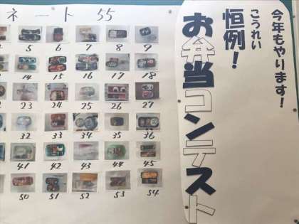 毎年恒例となりつつありますが、6年生が家庭科の調理実習で作ったお弁当の写真を掲示しています。その中でいいと思うのを投票しています。来校時よければ投票お願いします。