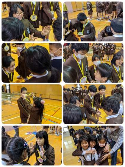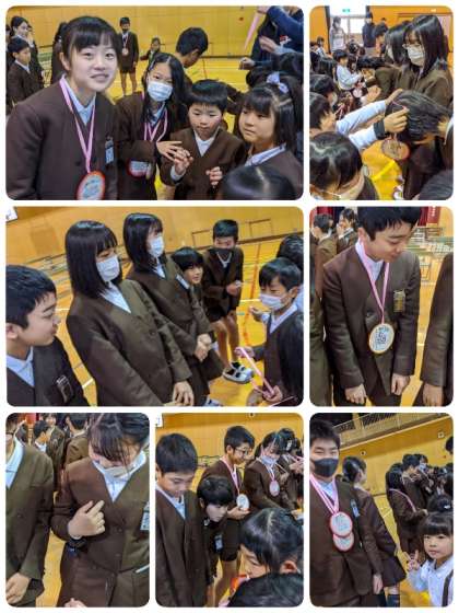 本来は3月4日の「6年生の卒業を祝う会」で、6年生にプレゼントする予定だった、縦割り班の1年生から5年生のみんなで心を込めて作ったメダルを、本日3時間目に縦割り班の1年生が代表で6年生のお兄さんお姉さんにプレゼントしました。