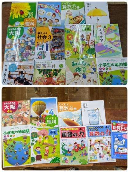 4年生は、国語の上、算数の上、理科、わたしたちの大阪、音楽、地図帳、計算ドリル、国語の力、算数の力の計9冊です。