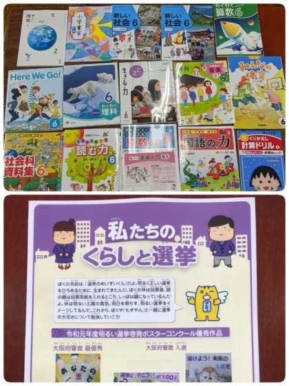 6わ年生は、国語、書写、算数、理科、社会(歴史編)、社会(政治国際編)、音楽、Here We Go!、道徳(生きる力)、みんなの体育、社会科資料集、計算ドリル、国語の力、算数の力と答え、読む力、私たちのくらしと選挙の計17冊です。