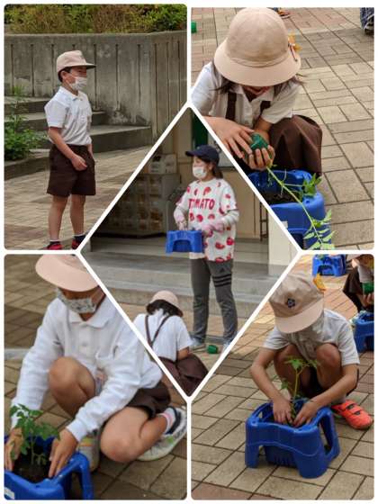 2年生はミニトマトの苗を植木鉢に植えました。先生の説明を見たり聞いたりしながら、取り組んでいました。植えた後は、お水やりをし、ダンスをしたり縄跳びをして、適度な運動をしていました。