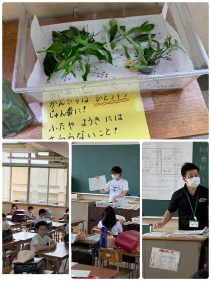 3年生は、理科の「チョウをそだてよう」で、学校で準備していたアゲハチョウの幼虫やサナギの紹介がありました。観察についての説明が担任の先生からありました。