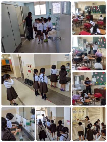 手洗いの仕方を学ぶ時、ソーシャルディスタンスも意識しています。