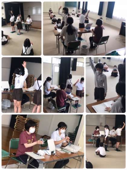 6年生は今週は全員一斉に登校し、3分割で教科担任制のような学習スタイルで学んでいます。今日は国語と算数と理科を3人の先生が順番に回って授業をしていました。また、感染拡大防止に配慮しながら聴力検査も順番に行いました。