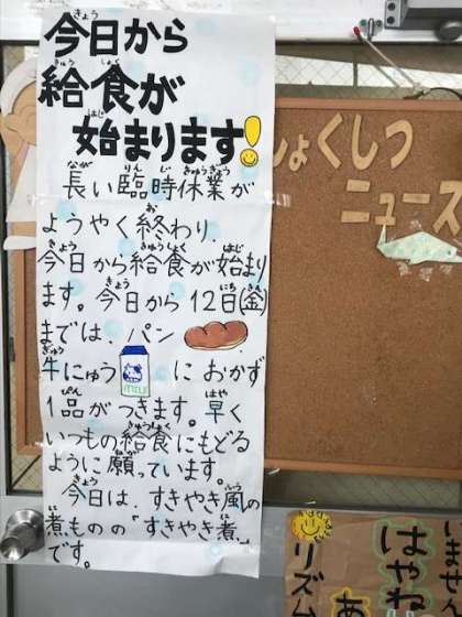 給食も始まりました。ただ、まだパンと牛乳と副食一品という形です。