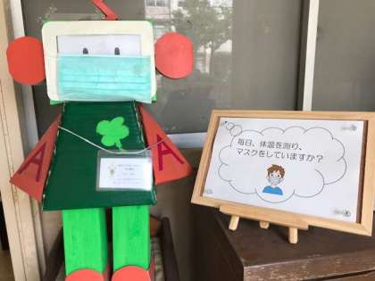 感染拡大防止のため、学校にいる間はマスクをつけておきましょう。朝、熱を測ってくるのも忘れないでね。