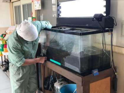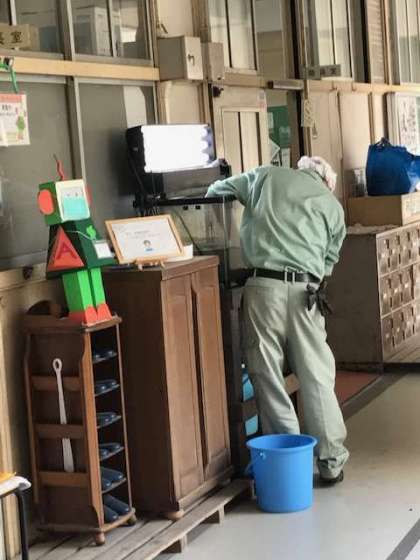 管理作業員の増田さんが、校長室前の水槽をきれいにしてくださいました。