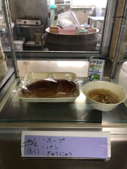 今日の給食は、スープ、黒糖パン、牛乳です。日に日に暑くなってきています。牛乳をしっかり食べて、元気な毎日を送りましょう。