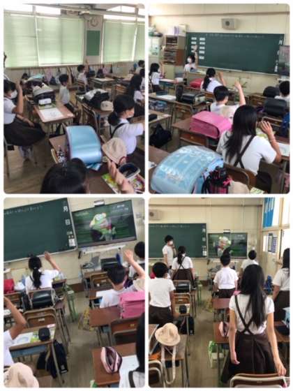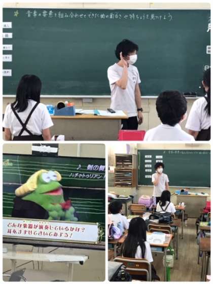 音楽の学習をしていました。音楽科では感染拡大防止のため、合唱やリコーダー、鍵盤ハーモニカの演奏は、現時点ではやめています。そこで、まずは、単元を入れ替えて、鑑賞の学習から始めています。音楽の仕組みに気づけているか、手をあげたり立ったりして表現していました。