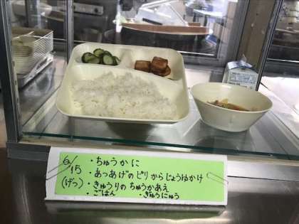 今日から給食もいつもの給食に戻りました。ご飯の日でした。このおかずにはやはりご飯です。美味しい給食に、感謝していただきます。