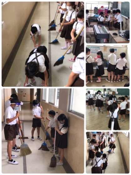1年生に、掃除の仕方を6年生が優しく教えています。