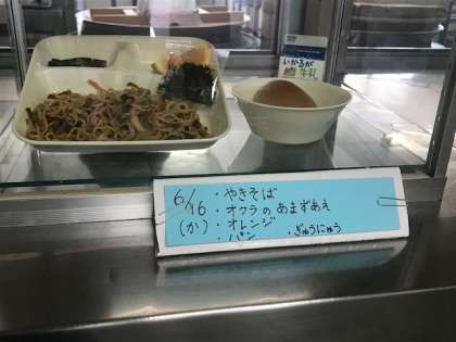 焼きそば、オクラの甘酢和え、オレンジ、パン、牛乳