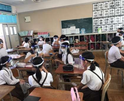 話し合い活動中は、きちんとフェイスシールドを着用し、ソーシャルディスタンスをとってお互いの意見を出し合いました。